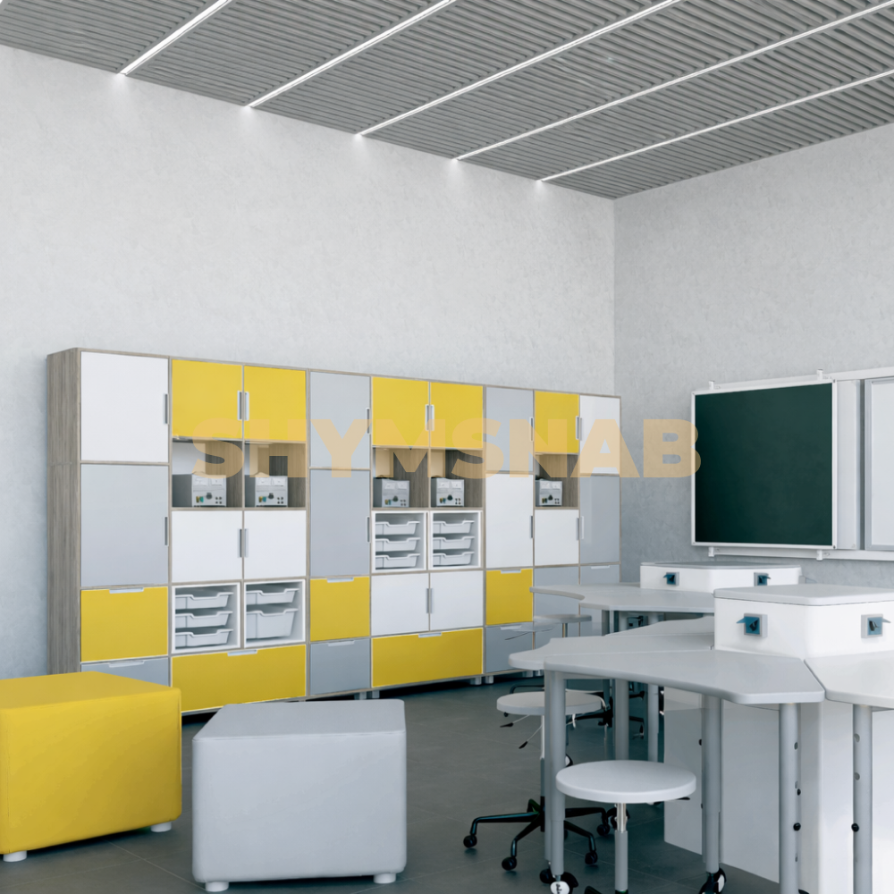 Модуль 2х5 выполнен из ЛДСП 22 и 16мм. Четыре опоры с регулировкой компенсируют неровности пола. Встроенная литая ручка без выступающих элементов исключает вероятность травматизма. Модуль 2х5 состоит из нижнего модуля 2х3 и надставки 2х2 с распашными дверцами и открытыми ячейками. Ячейки нижнего модуля укомплектованы переставными ЛДСП боксами с контейнерами-накопителями различной высоты из ударопрочного полистирола (пластик). Выдвигается накопитель по специальным направляющим с фиксатором против выпадания.