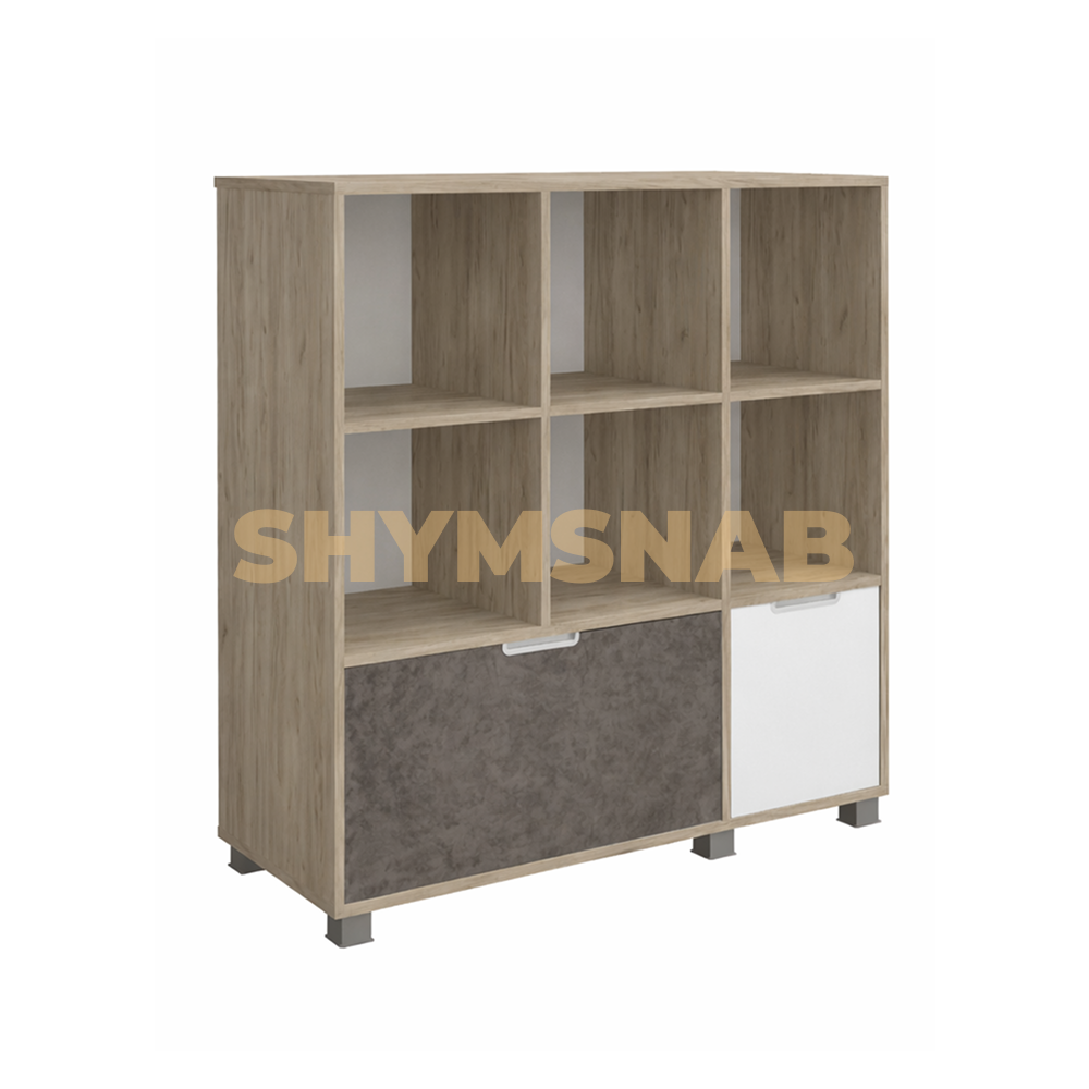 Модуль 3х3 выполнен из ЛДСП 22 и 16мм. Шесть опор с регулировкой, компенсируют неровности пола и обеспечивают жесткость конструкции.Модуль имеет два выдвижных нижних ящика и верхние ячейки.