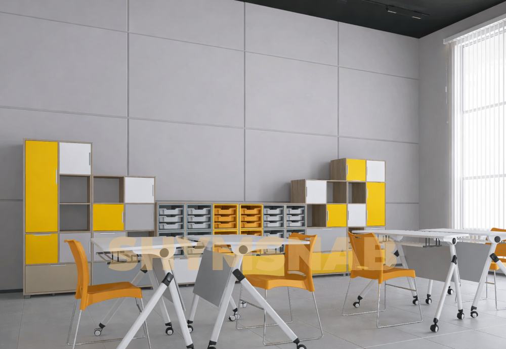 Система хранения Фреш 2 изготовлена из ЛДСП 22 и 16мм. Состоит из сочетания модулей 1х3, 2х3 и 3х2. Система хранения прекрасно подходит для кабинетов небольшой площади и позволяет хранить много учебного и рабочего материала. Система укомплектована нижними выдвижными ящиками и ячейками. Модули 1х3 состоят из нижнего выдвижного ящика и двух ячеек закрытых одной распашной дверцей. Модули 2х3 укомплектованы распашными дверцами, открытыми ячейками и нижним выдвижным ящиком. По центру модуль 3х2 полностью оснащен выдвижными ящиками. Выдвижные ящики и дверцы оснащены литой встроенной ручкой, которая исключает причины травматизма. Квадратные опоры с регулировкой обеспечивают компенсацию неровности пола. Система хранения прекрасно подходит для учебных пространств школьных и дошкольных учреждений, а также офисов.