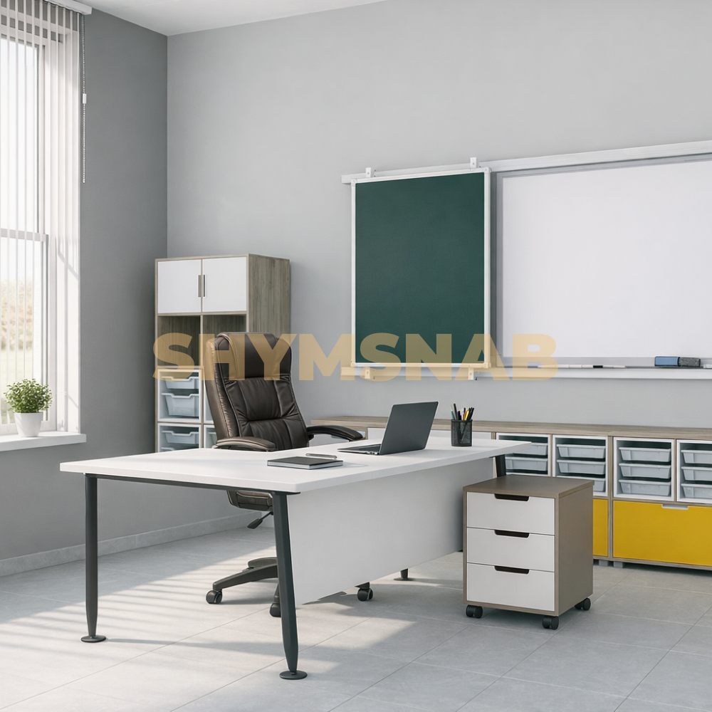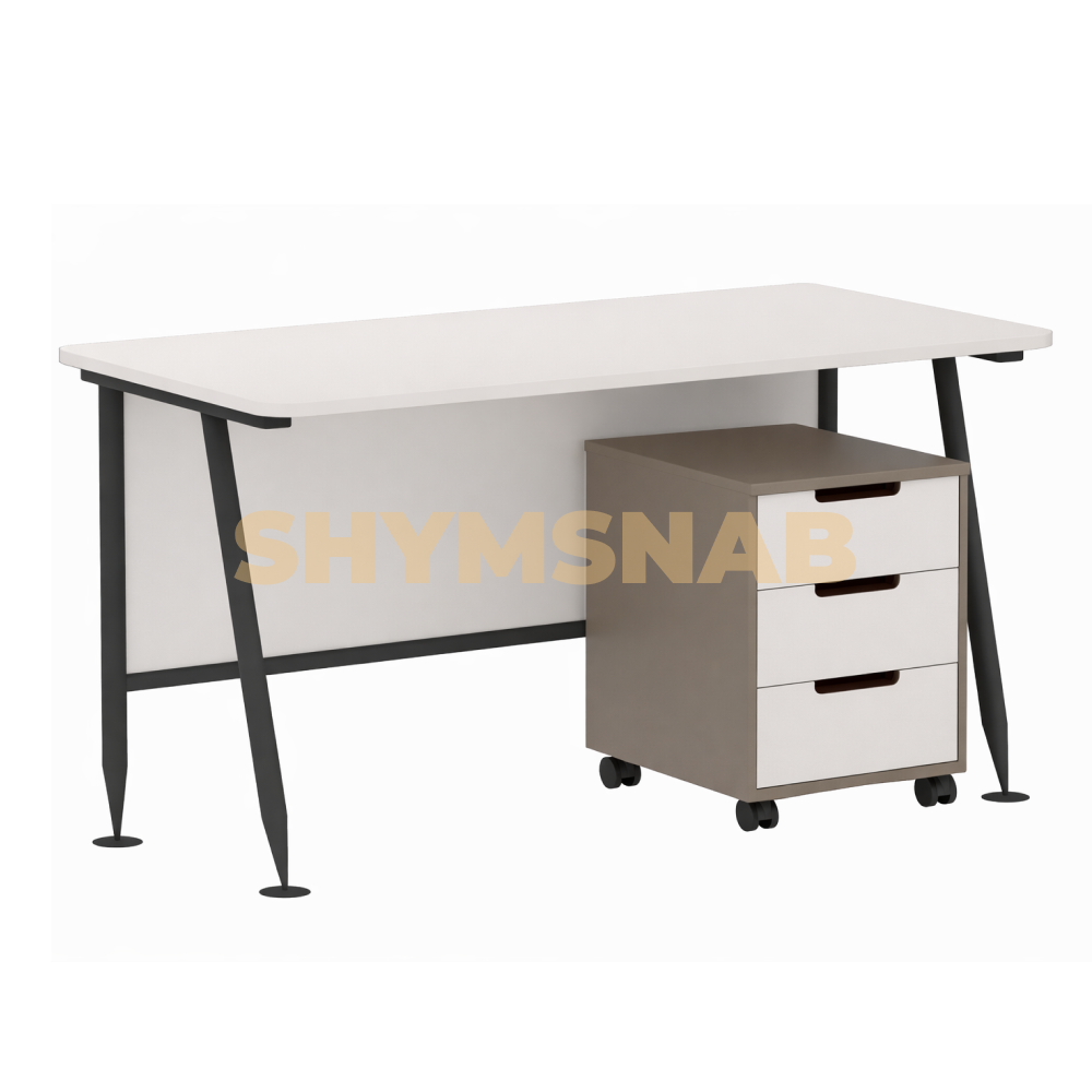 Классический вариант оснащения рабочего места учителя. Стол для преподавателя на металлическом каркасе, с подкатной тумбой. Столешница изготовлена из ЛДСП с кромкой в цвет. Ножки стола расположены под углом для устойчивого положения конструкции. Каркас изготовлен из круглой трубы покрытой износостойкой, порошковой краской. Подкатная тумба оснащена тремя выдвижными ящиками с литыми встроенными ручками.