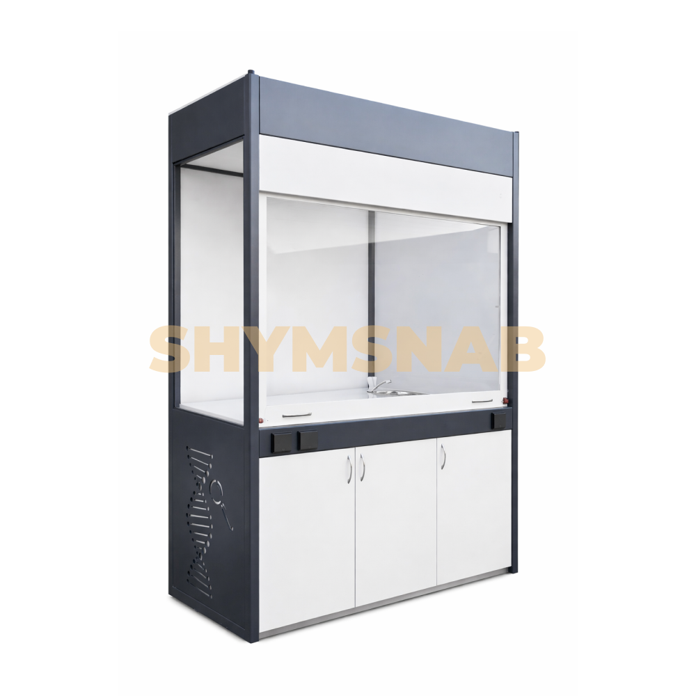 Шкаф вытяжной демонстрационный, оборудован сантехникой. Шкаф имеет переднюю панель, выполненную из оргстекла, которая закрывает отсек с раковиной. Нижняя секция шкафа имеет распашные двери, внутри оснащена полками. Двери оснащены ручками в форме дуги.