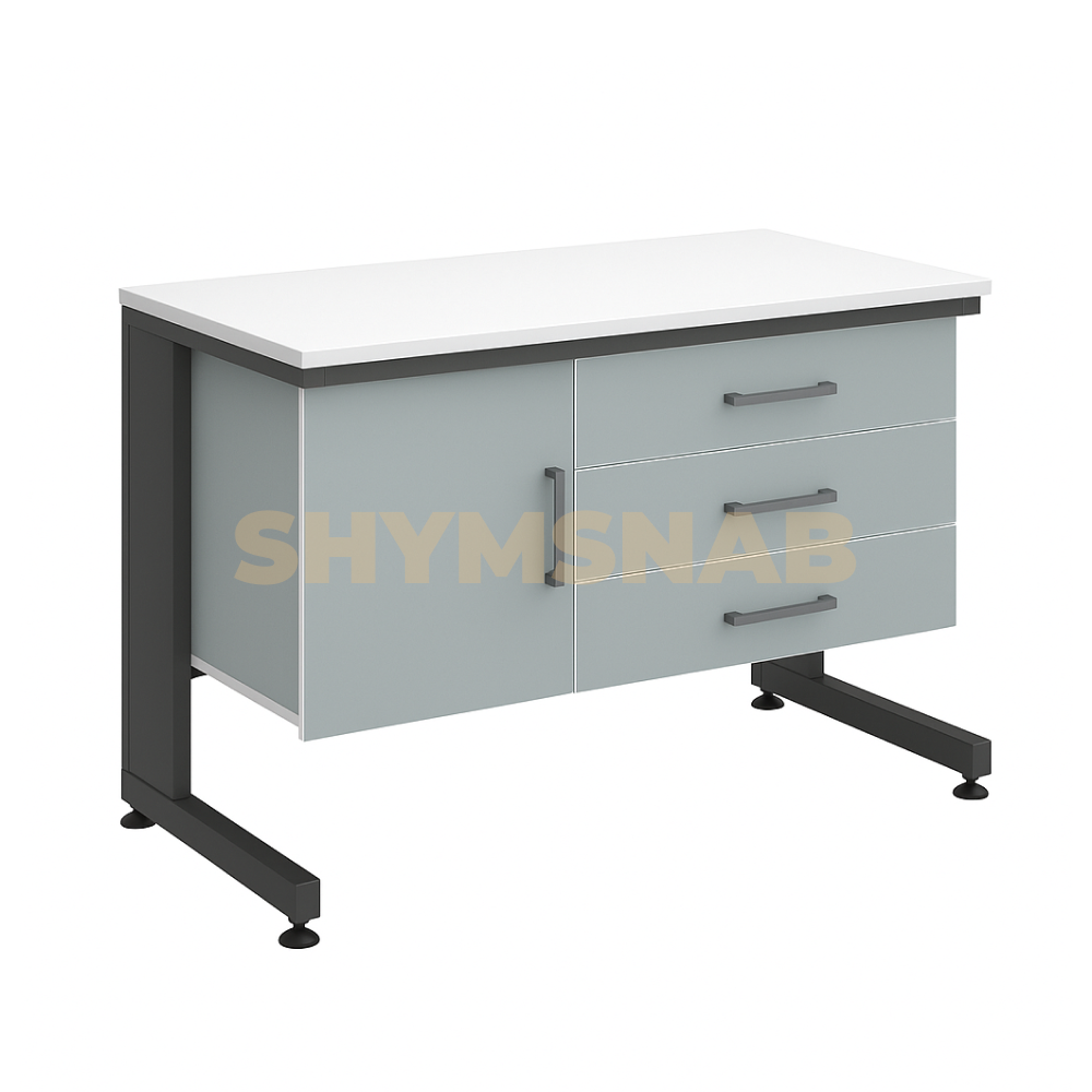 Стол -тумба лабораторный состоит из каркаса, столешницы и тумбы. Каркас из стальной трубы прямоугольного сечения покрыт порошково-полимерной краской устойчивой к внешним воздействиям. Задняя стенка стола закрыта металлическим экраном. На ножках каркаса для компенсации неровности пола, предусмотрены опорные винты регулировки. Столешница - плитный материал из ДСП с пластиковым покрытием с двух сторон, за счет которого стол защищен от внешних воздействий и прослужит вам много лет. Тумба подвесная, оснащена тремя выдвижными ящиками и отделением с распашной дверью.