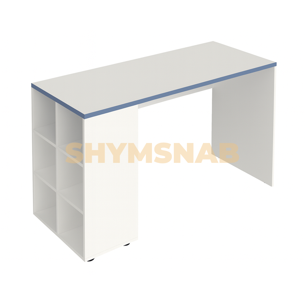 Стол для специализированных кабинетов, представляет собой корпус со столешницей и боковыми ячейками для хранения. Стол выполнен из ЛДСП, обработан белой кромкой. Одна опора стола имеет три яруса открытых ячеек для хранения учебного инвентаря, пособий и др.